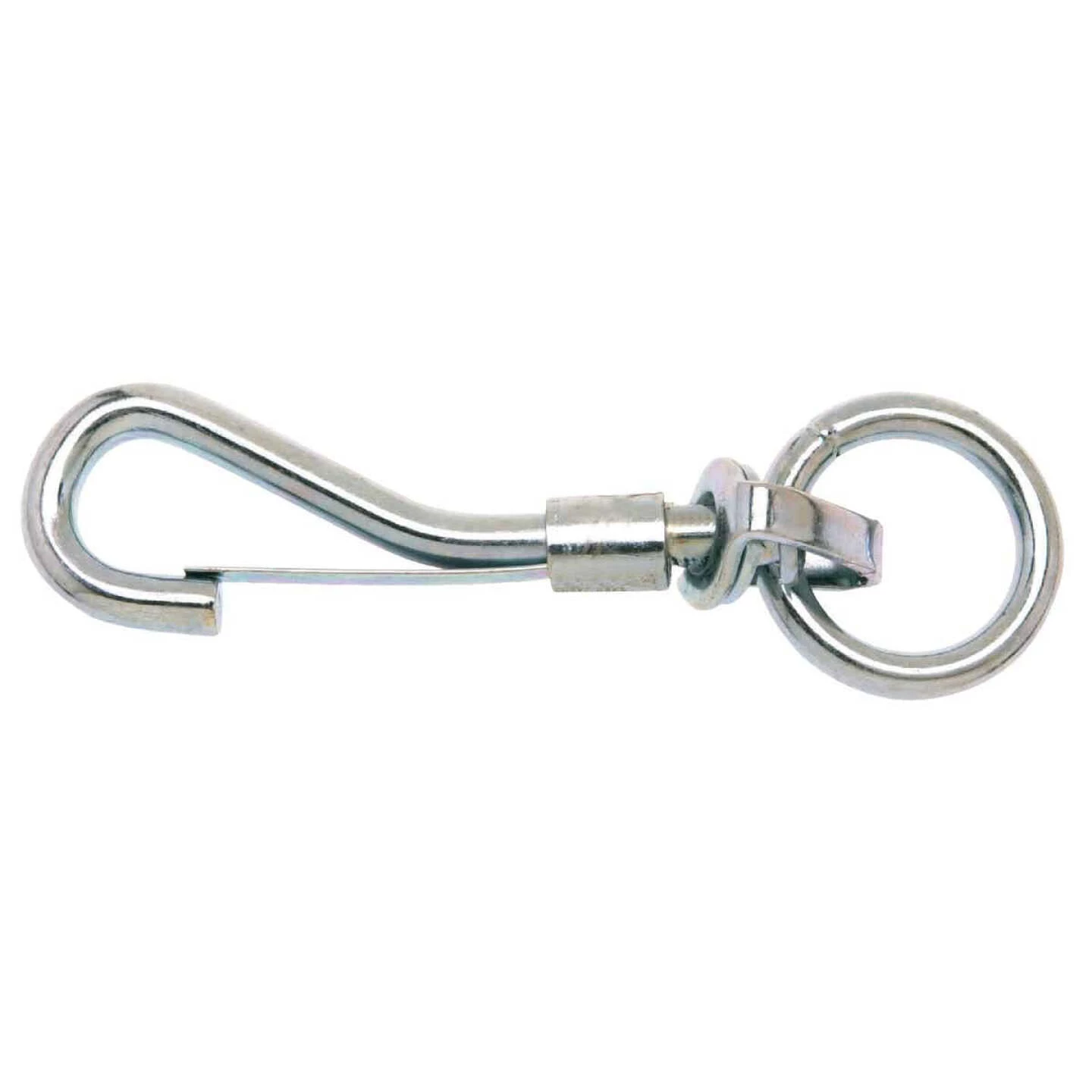 Swiveling, round eye spring snap. Malleable iron construction featuring a durable zinc finish for long life. 3/4-inch eye size. 30-pound working load limit.